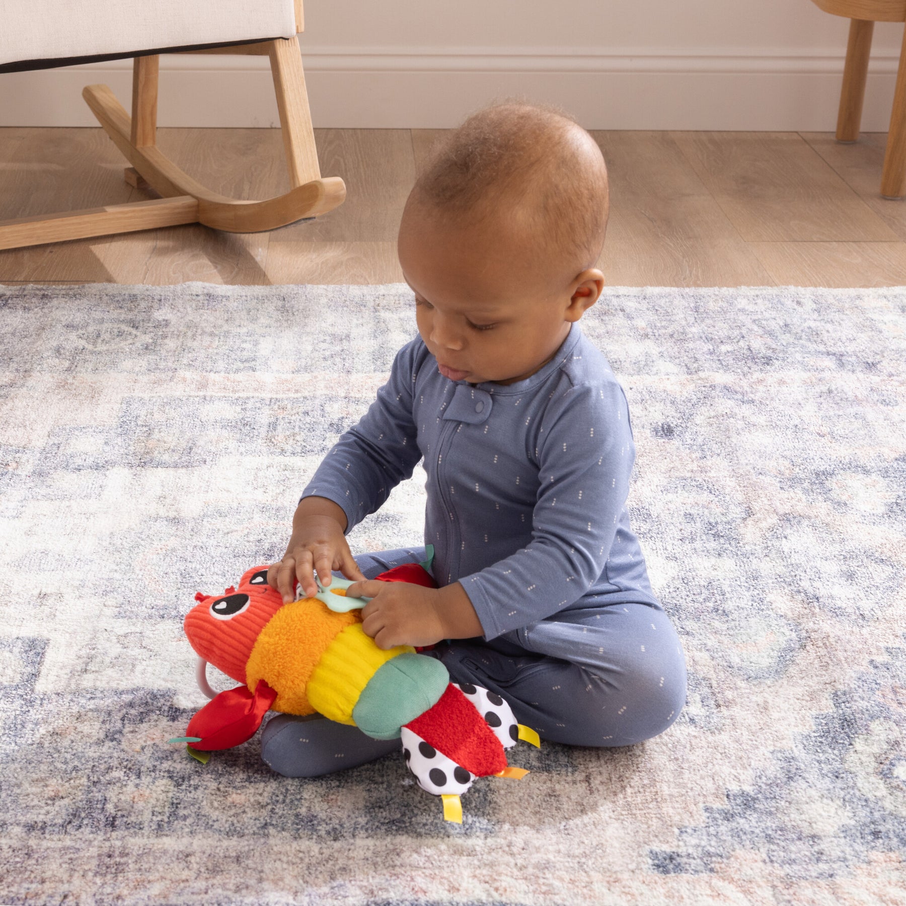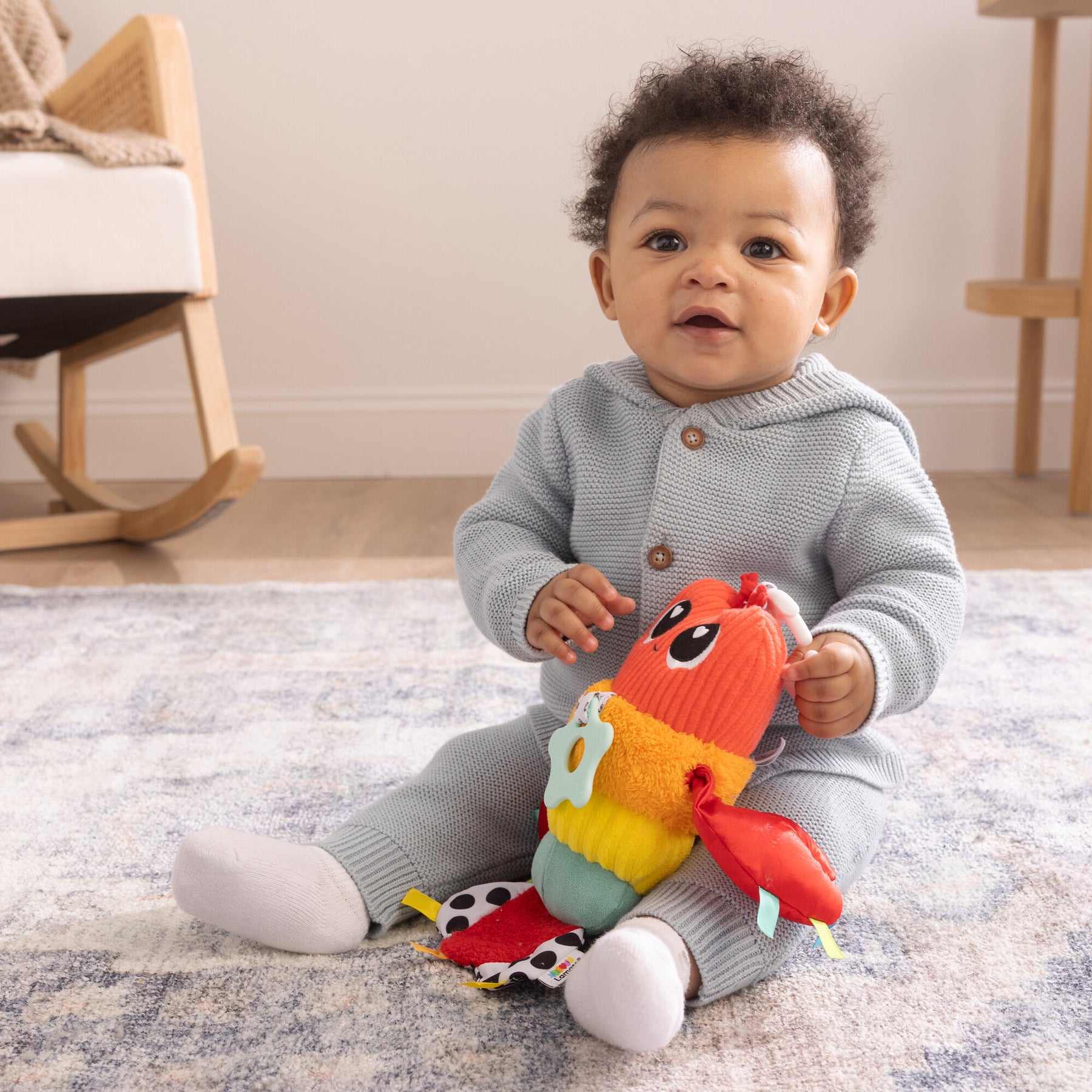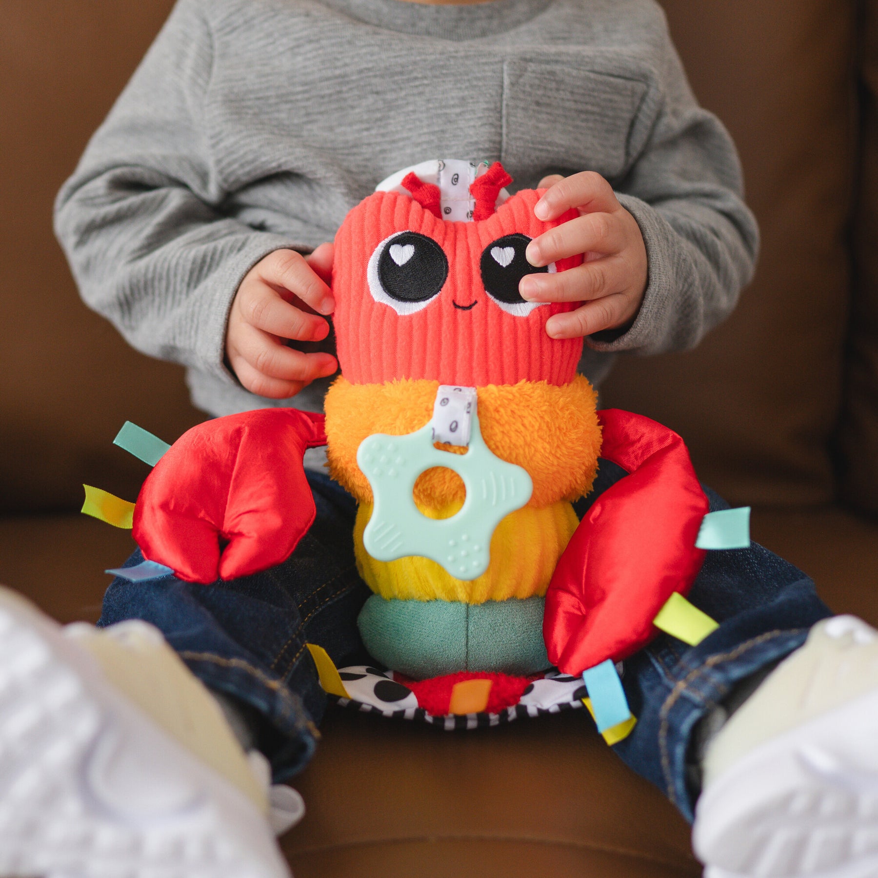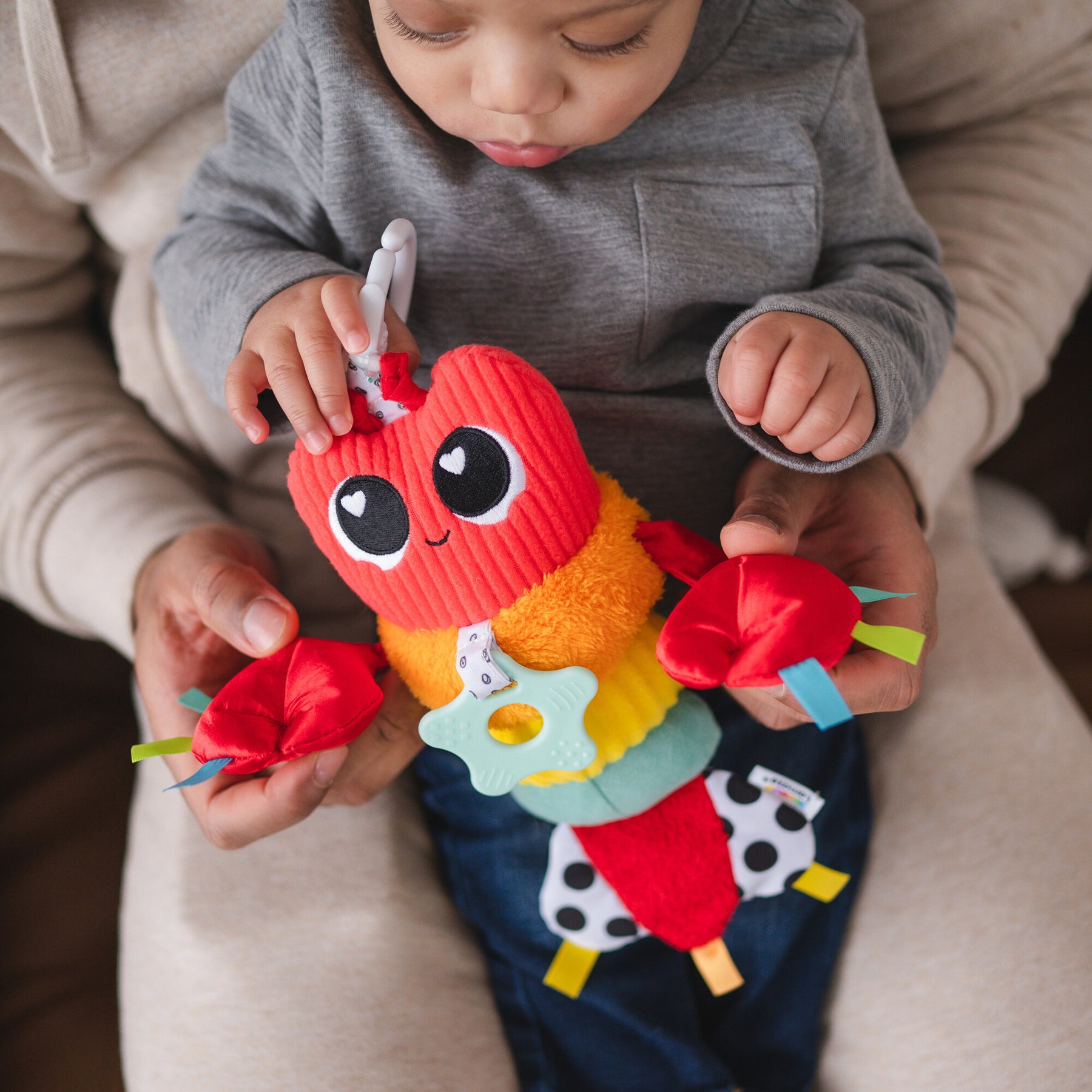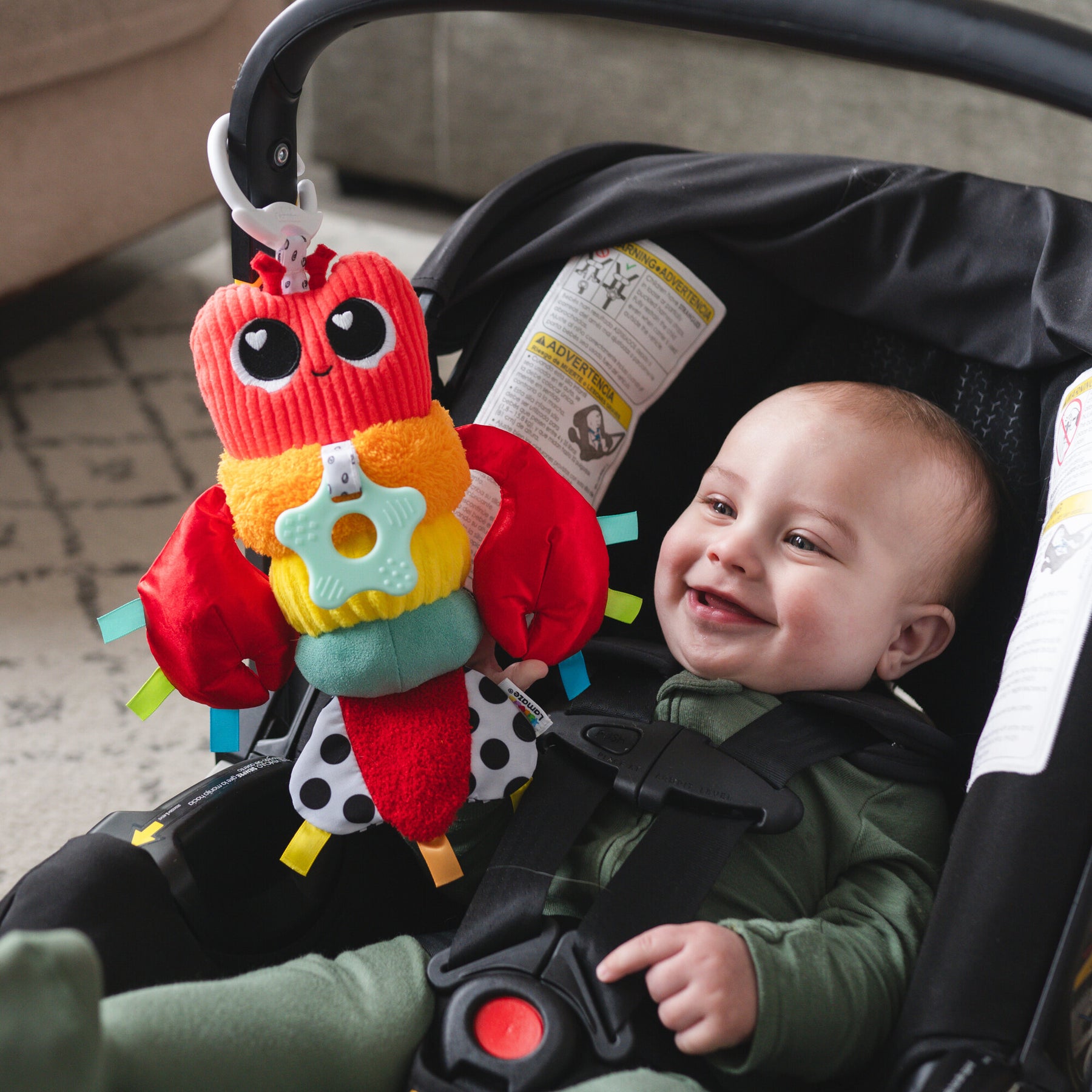 Today’s catch is full of fun thanks to Lamaze’s Liam the Lobster Clip & Go Toy! This cheerful lobster toy features bright colors and a soft body with multiple textures and ribbons for your baby to explore. Liam’s tail makes interesting crinkle sounds that encourage grasping, or you can shake him to show baby how he makes a gentle chiming sound. This is a fun way to introduce early cause and effect learning.