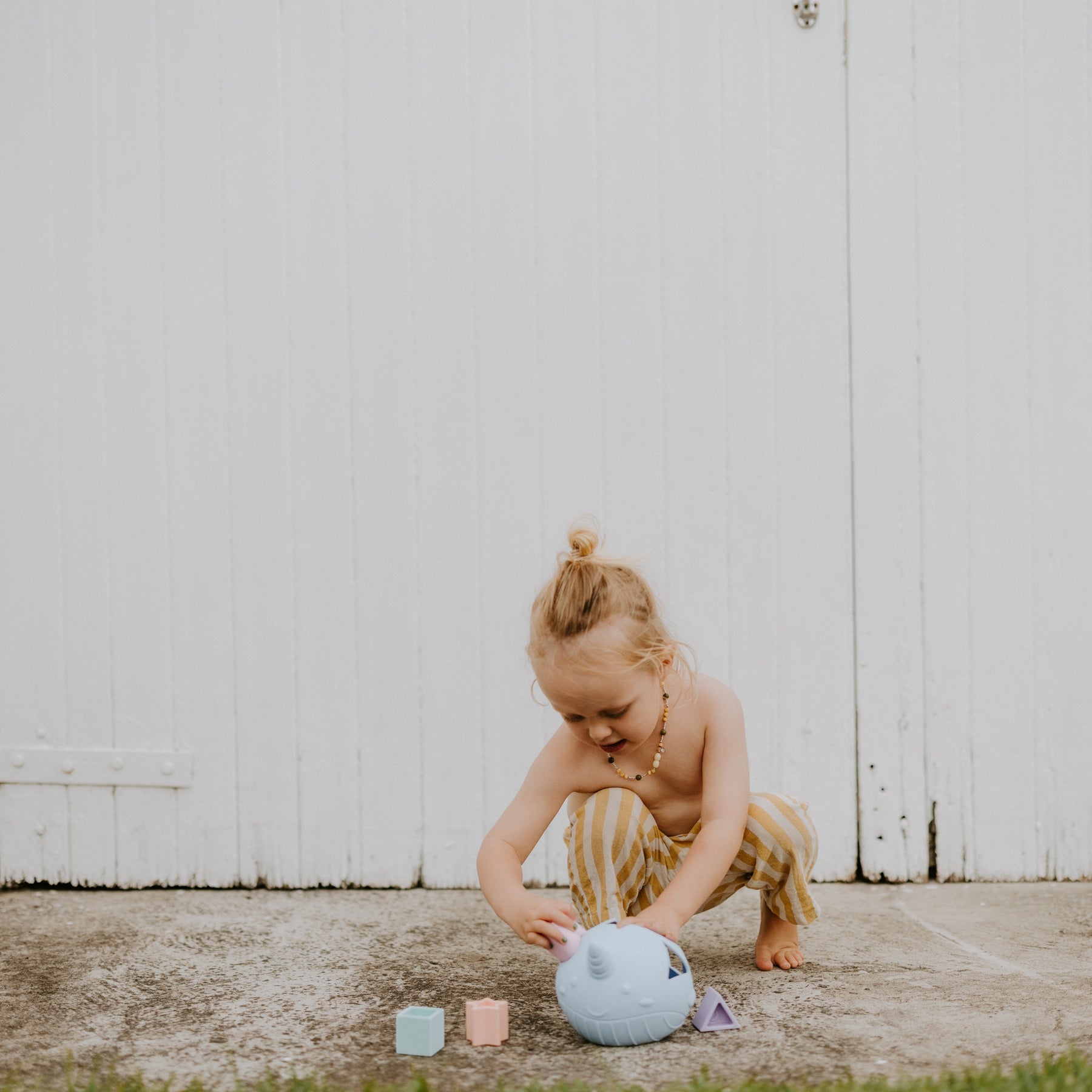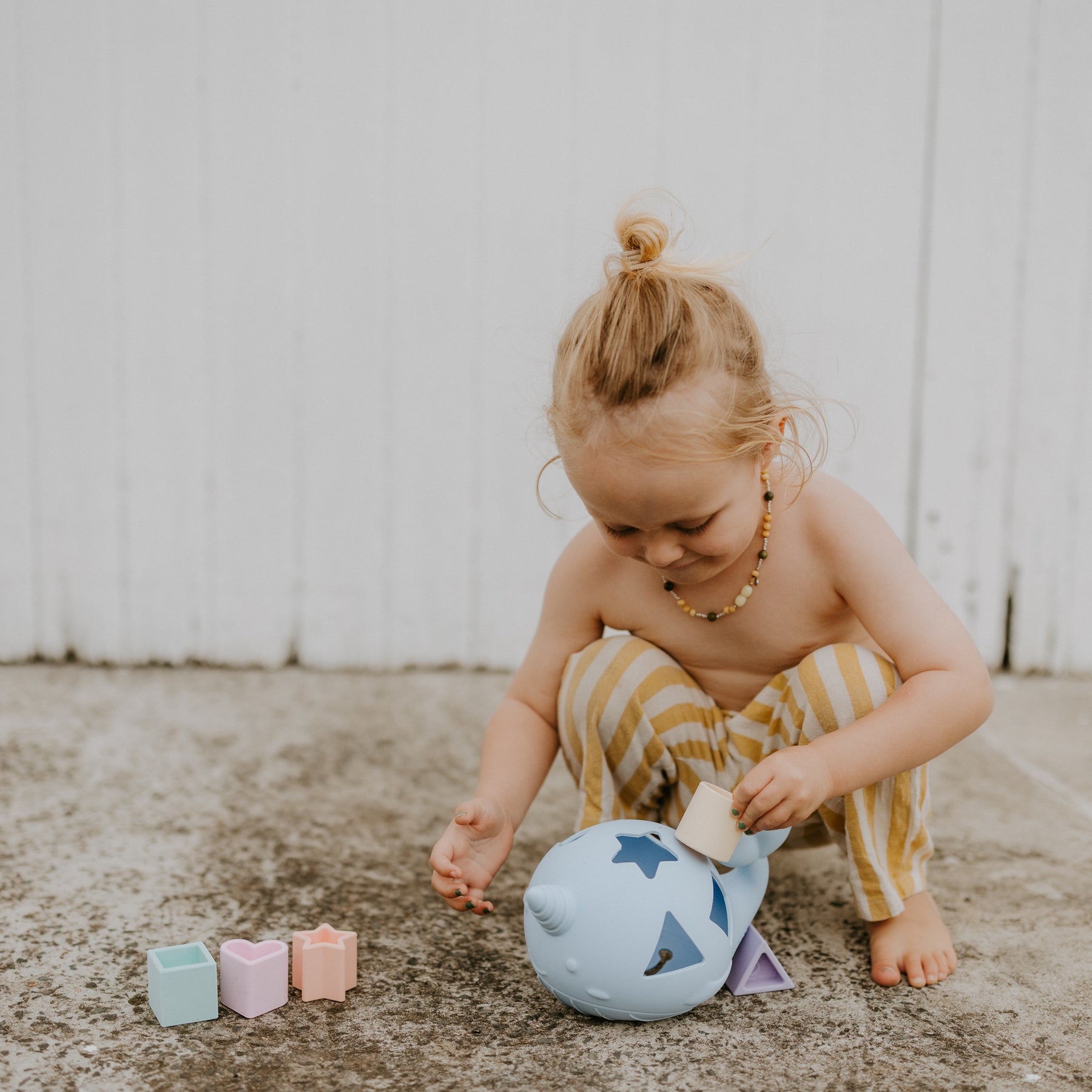 An educational playroom classic reimagined Jellystone style! Our magical narwhal is ready to play. Bubs and toddlers can discover shapes and develop fine motor skills as they sort each piece through the corresponding openings. With our specially designed base, the blocks hold within the narwhal but can be easily accessed when it is time to play again.