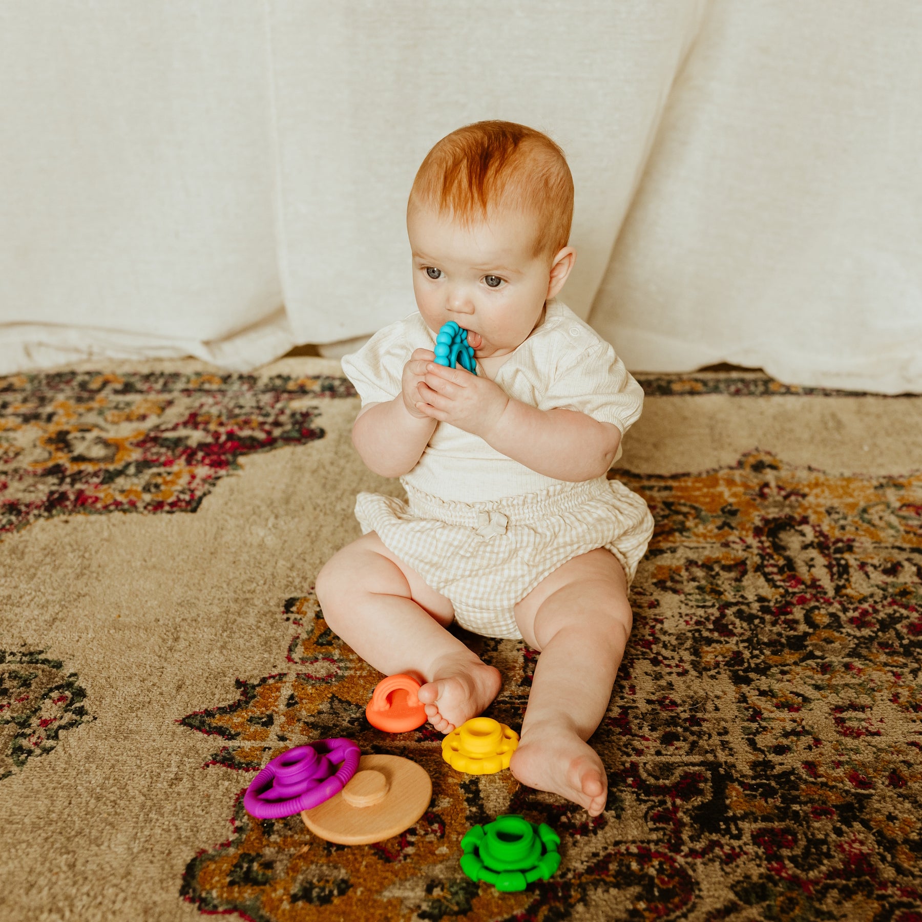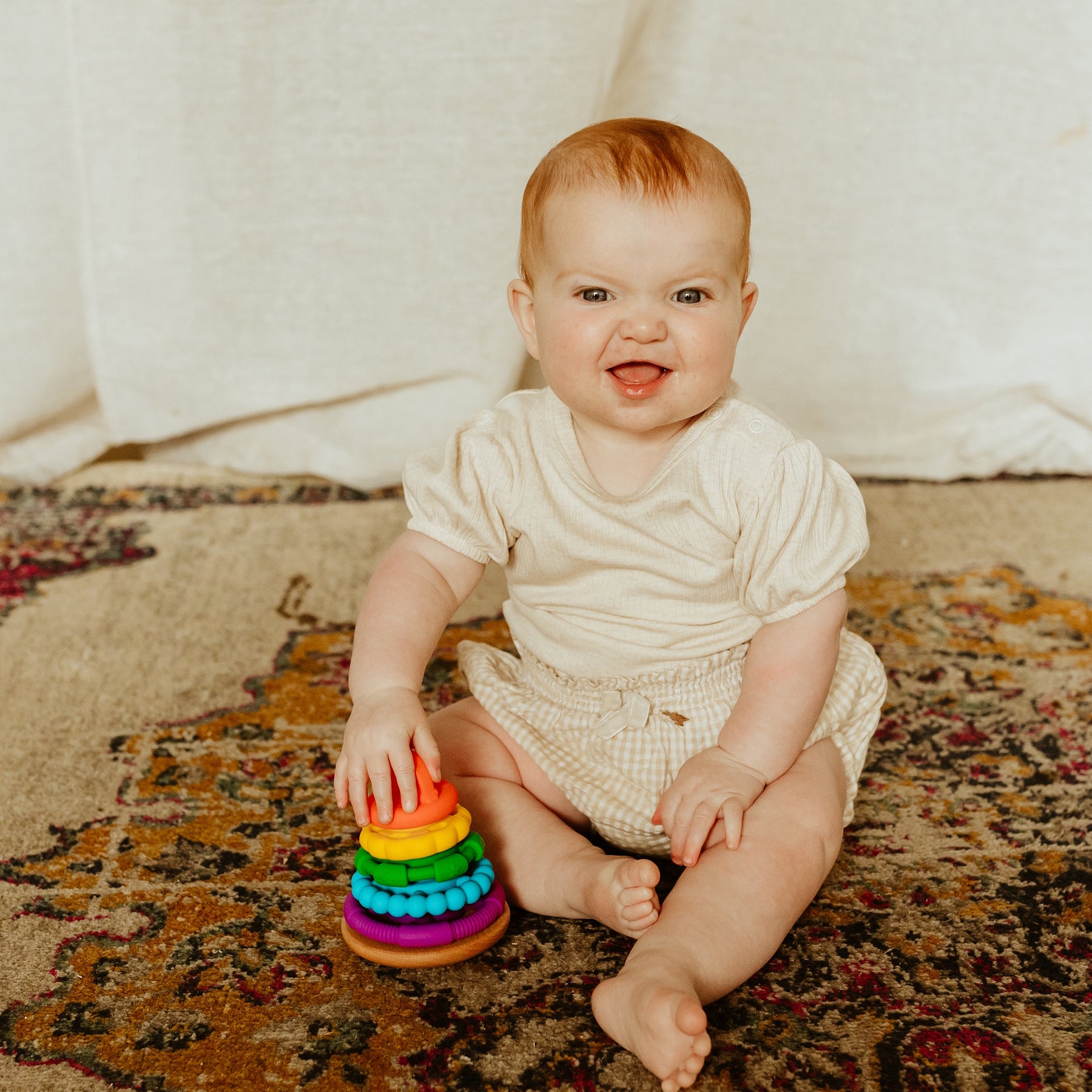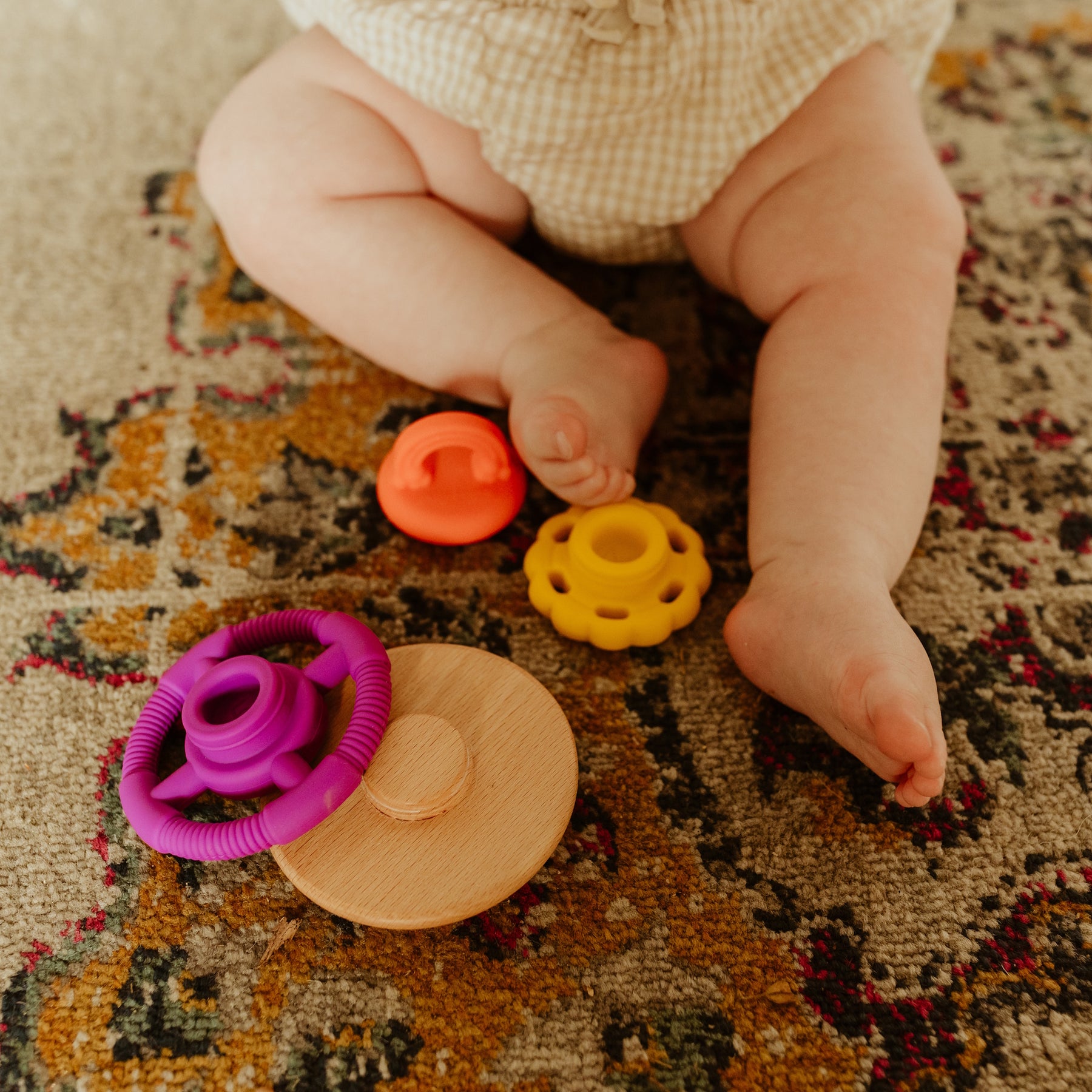 So beloved is our Rainbow Stacker, we decided to combine it with natural beech wood and create the Wobble Stacker! The base is uniquely designed to wobble back and forth when knocked by bub or you. Like our Rainbow Stacker, each piece comes apart and can stack in any order, encouraging hand-eye coordination while being the perfect teether.