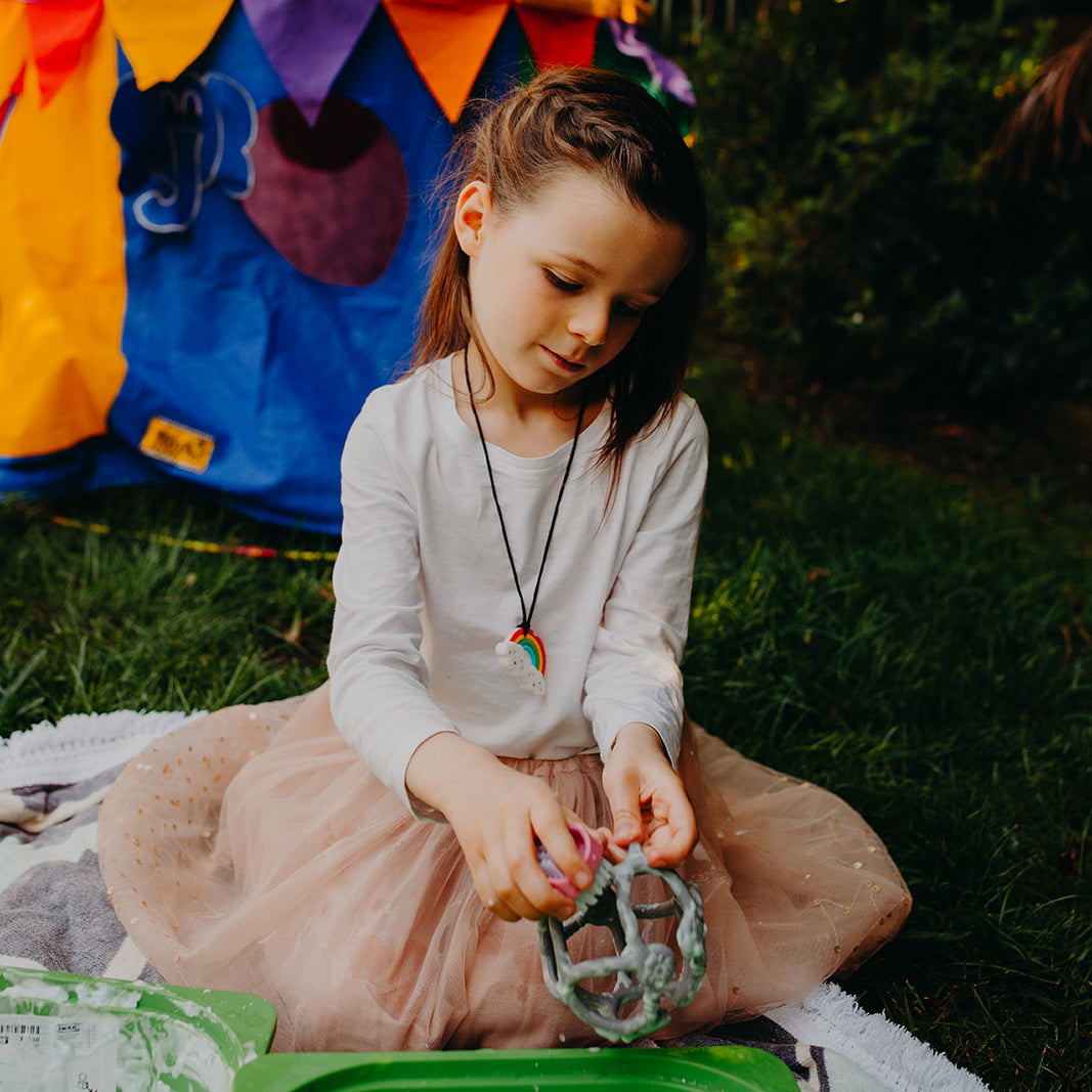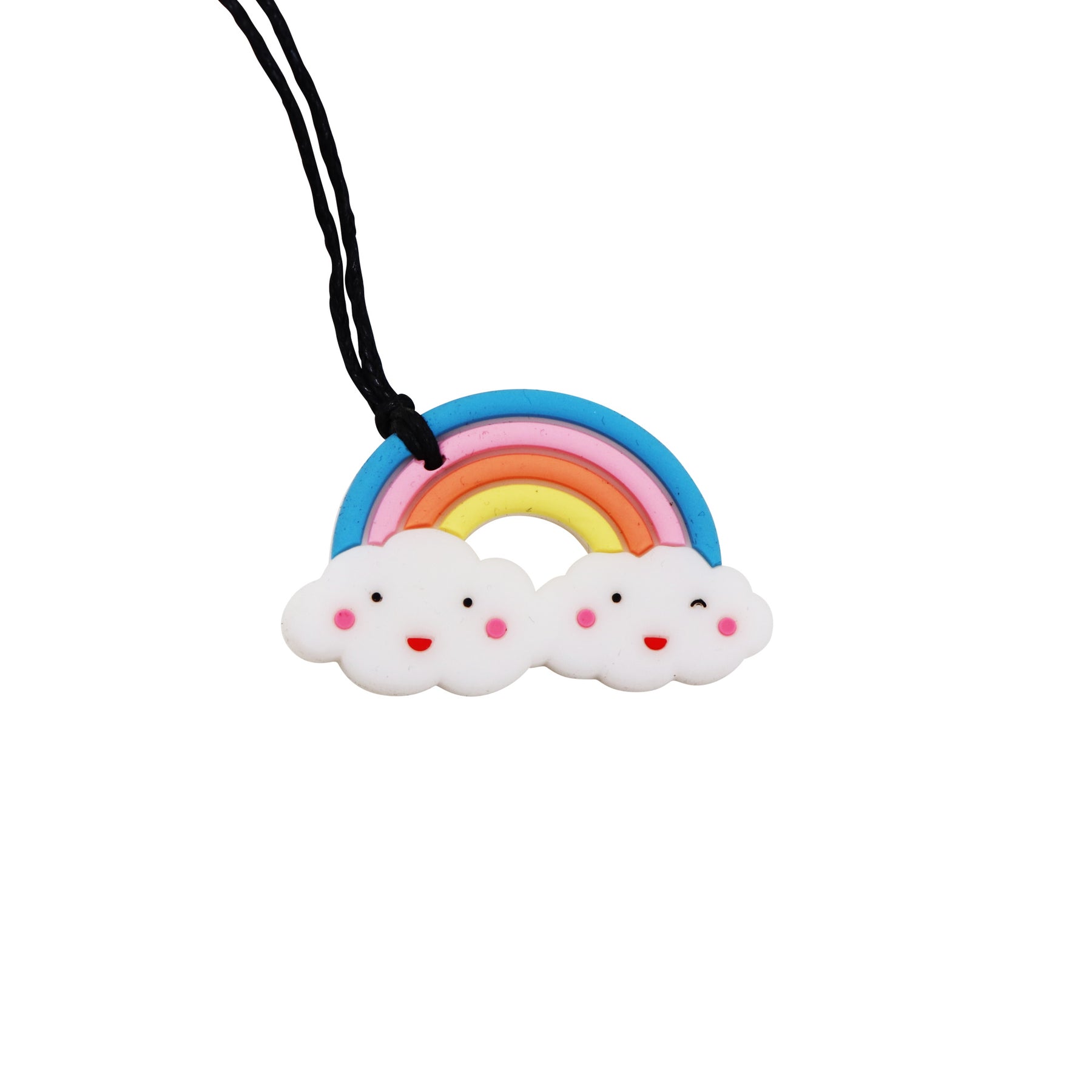 The Jellystone Rainbow Necklace features a BPA-free, 100% non-toxic food-grade silicone pendant to withstand the most strenuous of chews on a black necklace featuring our custom-designed safety clasp that separates easily when gently tugged. We've also ensured that the materials used to create our chews are super-simple to clean, making it easy to keep your child's Rainbow Pendant hygienically clean.