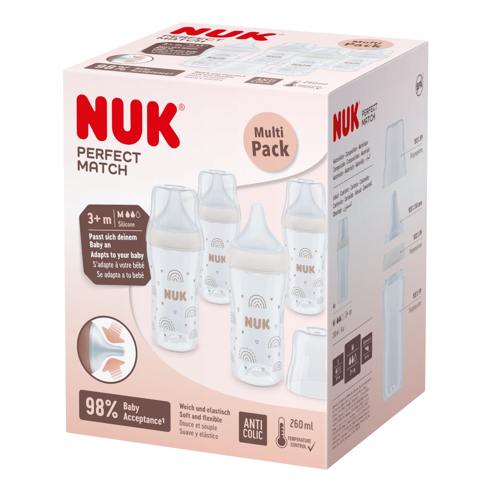 • 4 x NUK Perfect Match baby bottles made of high-quality glass, with patented Temperature Control indicator, 2 x 120ml in size S (from 0 months for breast milk), 2 x 230ml in size M (from 3 months for formula), 1x silicone teat size U (for independent drinking, babies from 6 months can regulate the drinking flow themselves)